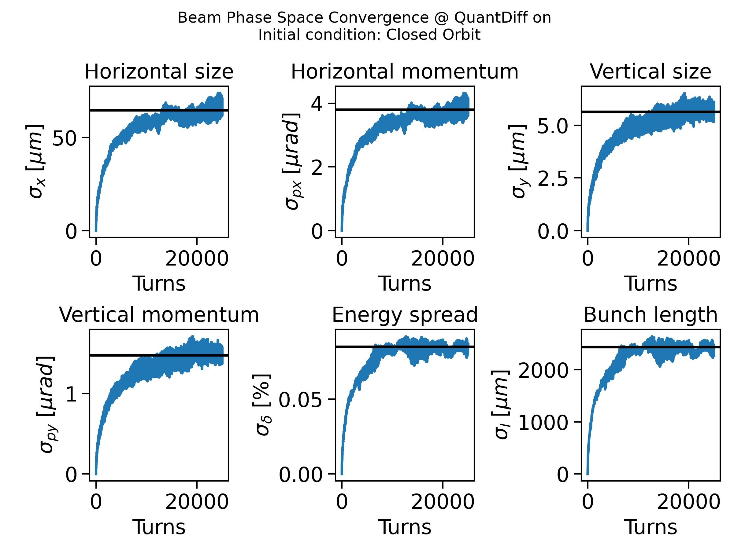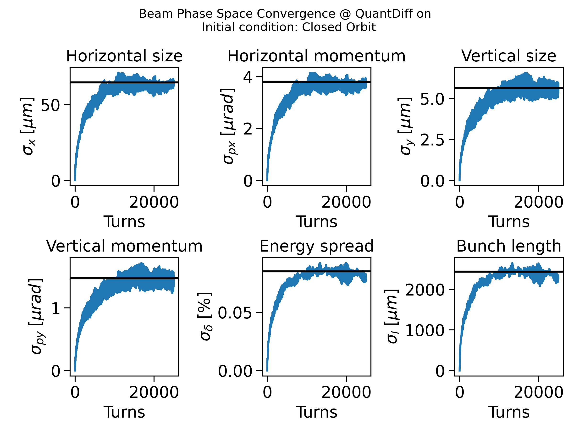 [0,0,0,0,0,0]. The equilibrium values (the straight black lines in the figure) were taken from the equilibrium beam envelope matrix.Normal distributed quantum kicks: