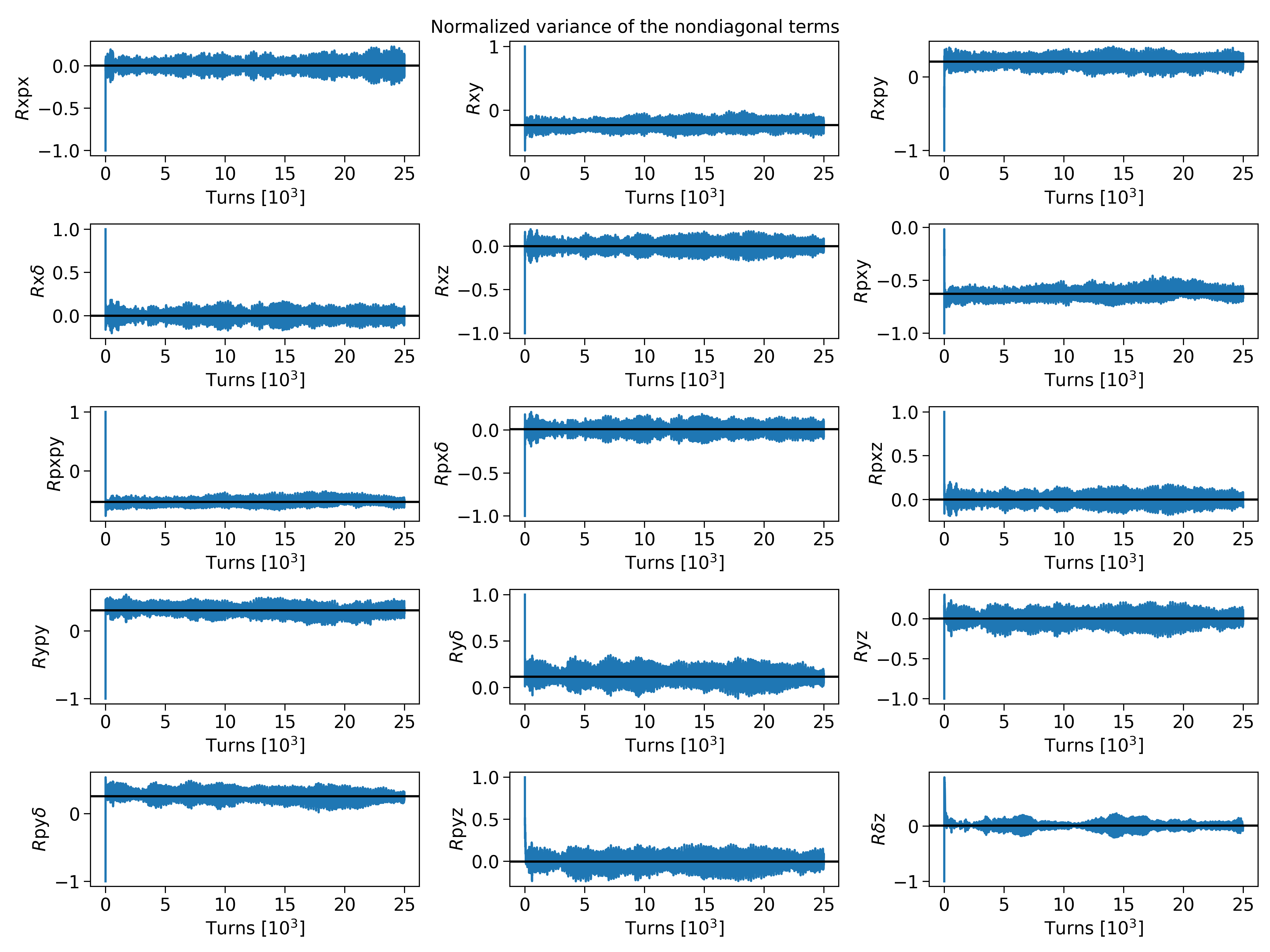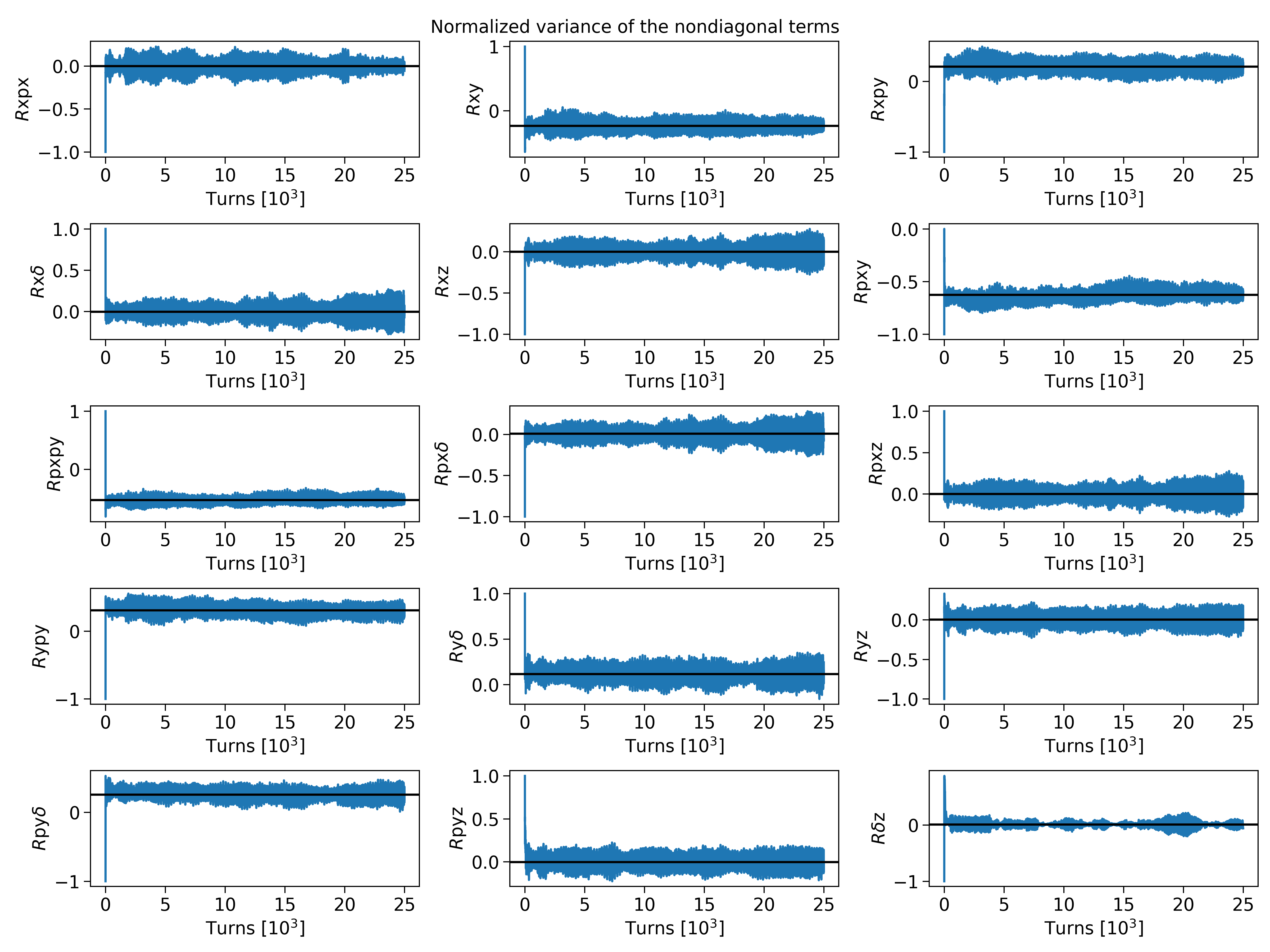 The non-diagonal terms of the beam envelope matrix were observed to oscillate around the equilibrium values. To express the oscillation amplitude in terms of more intuitive quantities, they were normalized by the correspondent diagonal terms (normalized covariance):