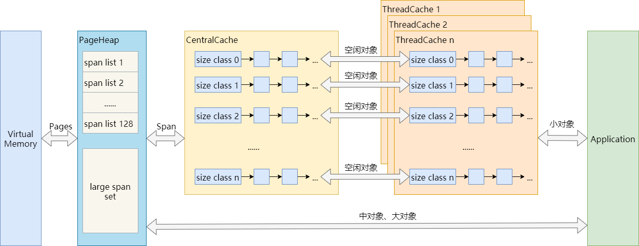 Central Free List 里面管理的是一堆span,span里面映射的就是size class list。span 是由一组连续的page组成的。它可以用来管理大对象,同时也可以将其拆分为多个小对象,当管理的是小对象的时候,span里面记录的就是一系列的size-class。