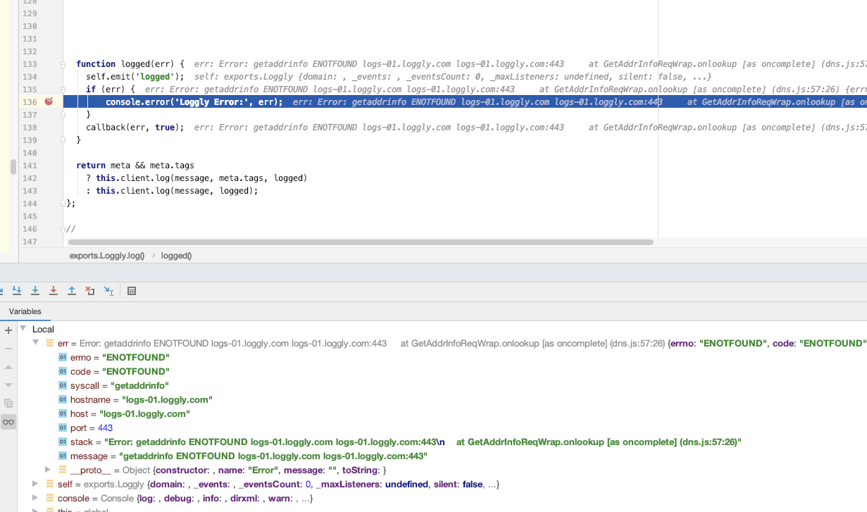 @Katulus you're right: I tested it by starting to run the project and disconnect the wifi, the error I got is ENOTFOUND Sounds like there are other cases that are not handled there, any idea how those cases should be handled? Could it be that these changes are needed to be implemented in node-loggly-bulk instead of here?. |