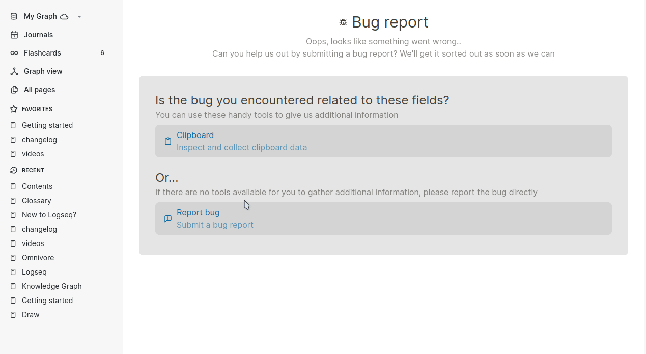 * feat: init page route for bug-report * feat: navigate to bug-report page in dropdown-menu * feat: add route for bug report tools * feat: export clipboard to map * fix: set-step! in promise and remove unused state * chore: there is no need to actively read from clipboard, just waiting copy-paste from user * chore: only parse dataTransfer * feat: initially done the clipboard data inspector * fix: use `util/copy-to-clipboard!` instead * feat: init page route for bug-report * feat: navigate to bug-report page in dropdown-menu * feat: add route for bug report tools * feat: export clipboard to map * fix: set-step! in promise and remove unused state * feat: initially done the clipboard data inspector * fix: use `util/copy-to-clipboard!` instead * fix: remove unused `:require` * ux: finetune clipbard inspector and bug report * feat: component `report-item-button` * fix: update text for clarity * fix: add subtext to button to fix lint error * fix: add missing argument * fix: change bg color to logseq css variable * fix: remove redundant div box in `report-item-button` Co-authored-by: Junyi Du <junyidu.cn@gmail.com> Co-authored-by: Bad3r <bad3r@protonmail.com>