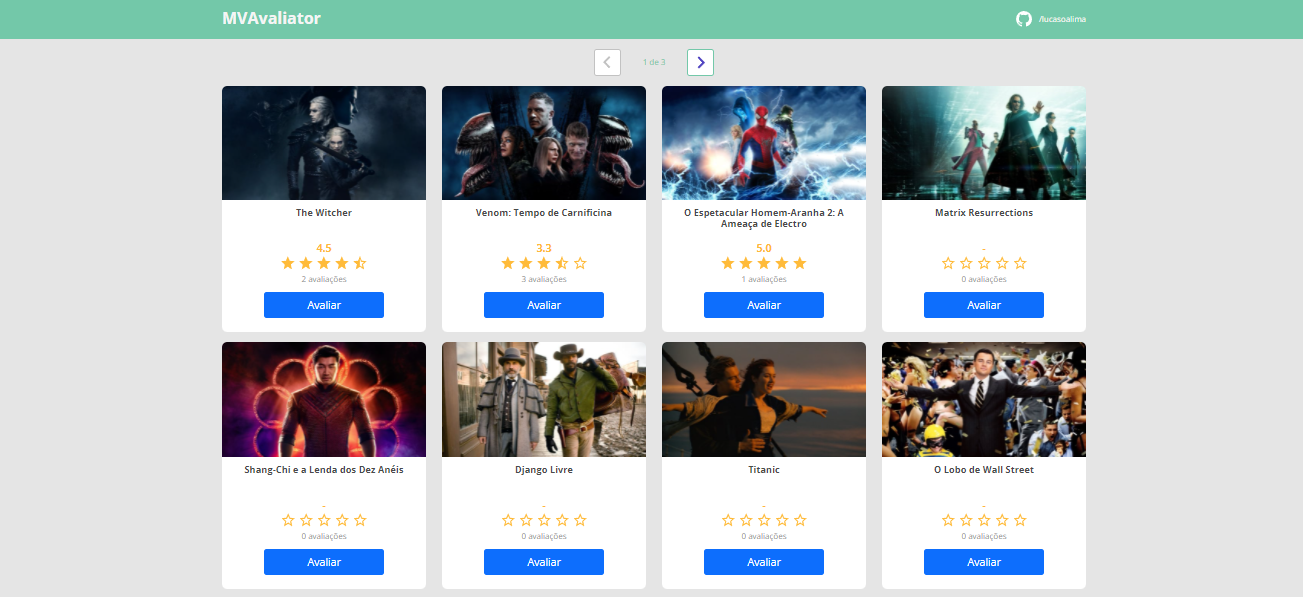 MV Review Site ๐ About: Personal project using Java-springboot and ReactJS about movies to improve my Java skills. ๐ป Languages and ๐ Tools: ๐ค Preview You can navigate into the project on Netlify. https://mvavaliator.netlify.app (Movies can take a while to load.) Lucas Soares de Lima LinkedIn ย GitHub