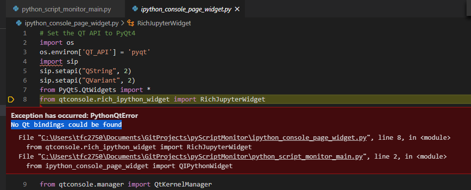 I have imported: PyQt5 pip install pyqt5 qtconsole pip install qtconsole When I try to run python_script_monitor_main.py, I get error: