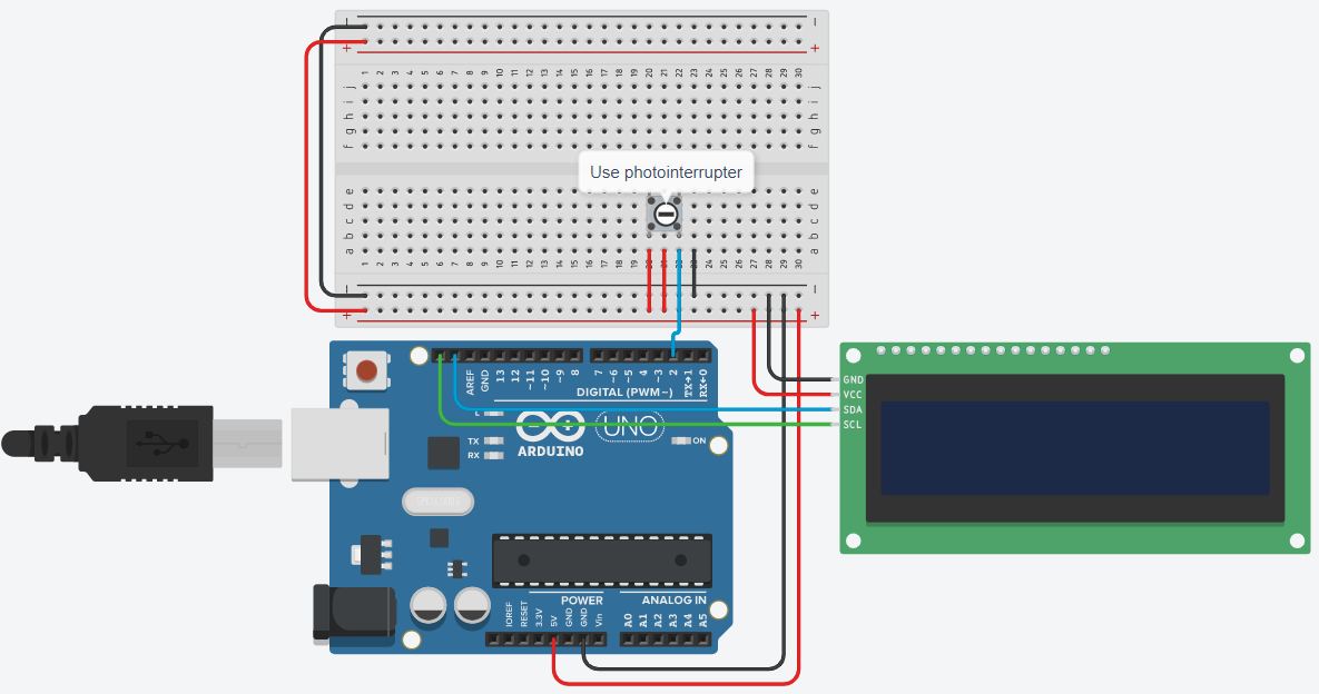 Since I was unable to locate a library for the photointerrupter, I designated it to be a digital input that would function similarly to a button in terms of sending input. Additionally, I discovered that if I increase the total before the photointerrupter has turned false, the code would continue counting until it is uninterrupted, thus I had to check the photointerrupter in a loop instead.