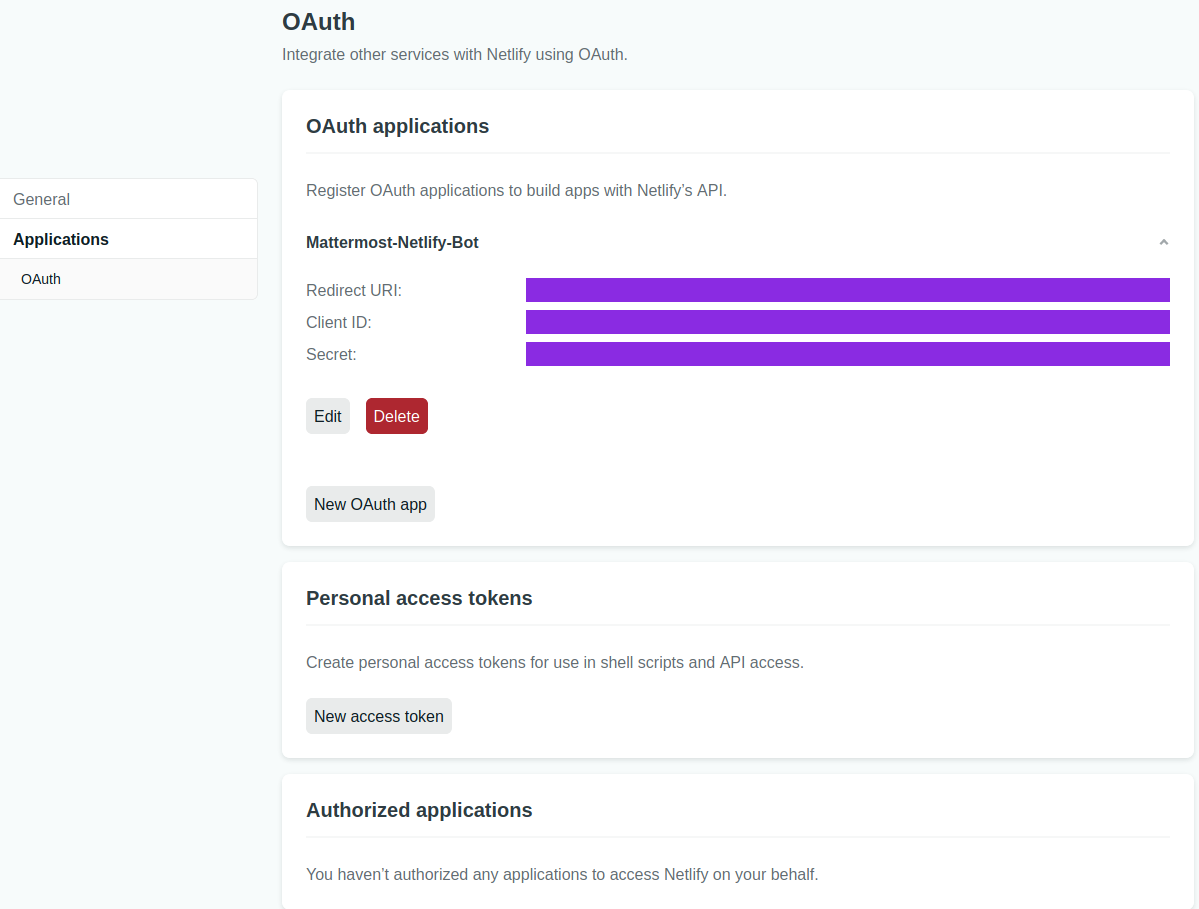 Enter the Application Name. The Redirect URI should be of /plugins/netlify/auth/redirect form. The site url is where you mattermost app is hosted. Example if you are installing it at the community the redirect url can be https://community.mattermost.com/plugins/netlify/auth/redirect . Description is optional field. Hit save button when fields are filled.