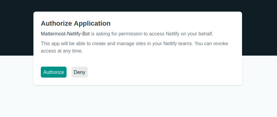 By executing this command, the bot will post a link into the channel. Following which authentication with Netlify can be performed. Any of the belows commands requests that connection being made first before execution. After successfully authentication access token is stored in encrypted form at mattermost database. Which is then used to perform various operations via netlify api.