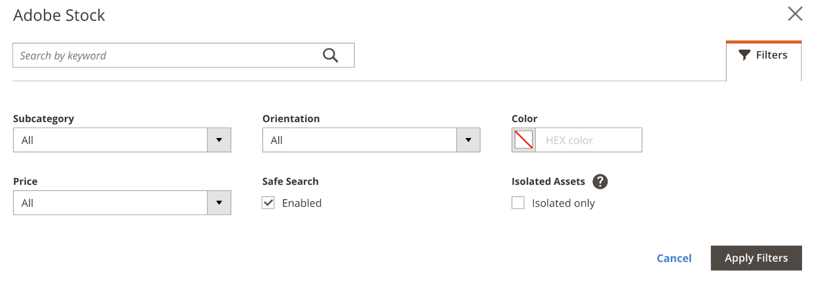 ## Description Set correct filters order on the grid The order should be: 1. Subcategory filter 2. Orientation filter 3. Color filter 4. Price filter 5. Safe search filter 6. Isolated Assets filter <img width="817" alt="Screen Shot 2019-06-28 at 14 03 09" src="https://user-images.githubusercontent.com/11355520/60365101-7aca9700-99ad-11e9-84ac-7a1817fc97c9.png">