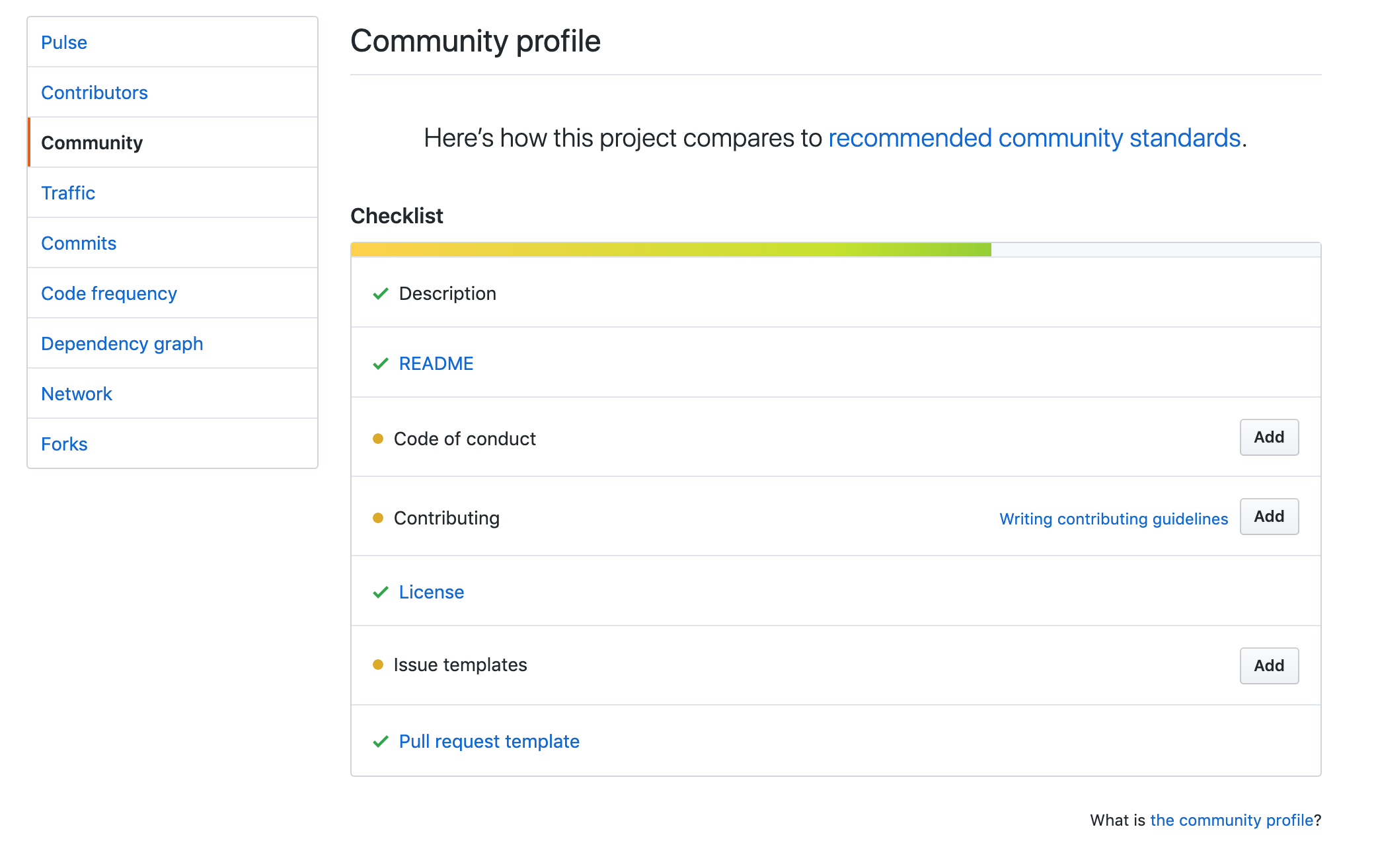 Reviewing the repo I noticed we have some items missing in the community profile comparing to the recommended community standards.