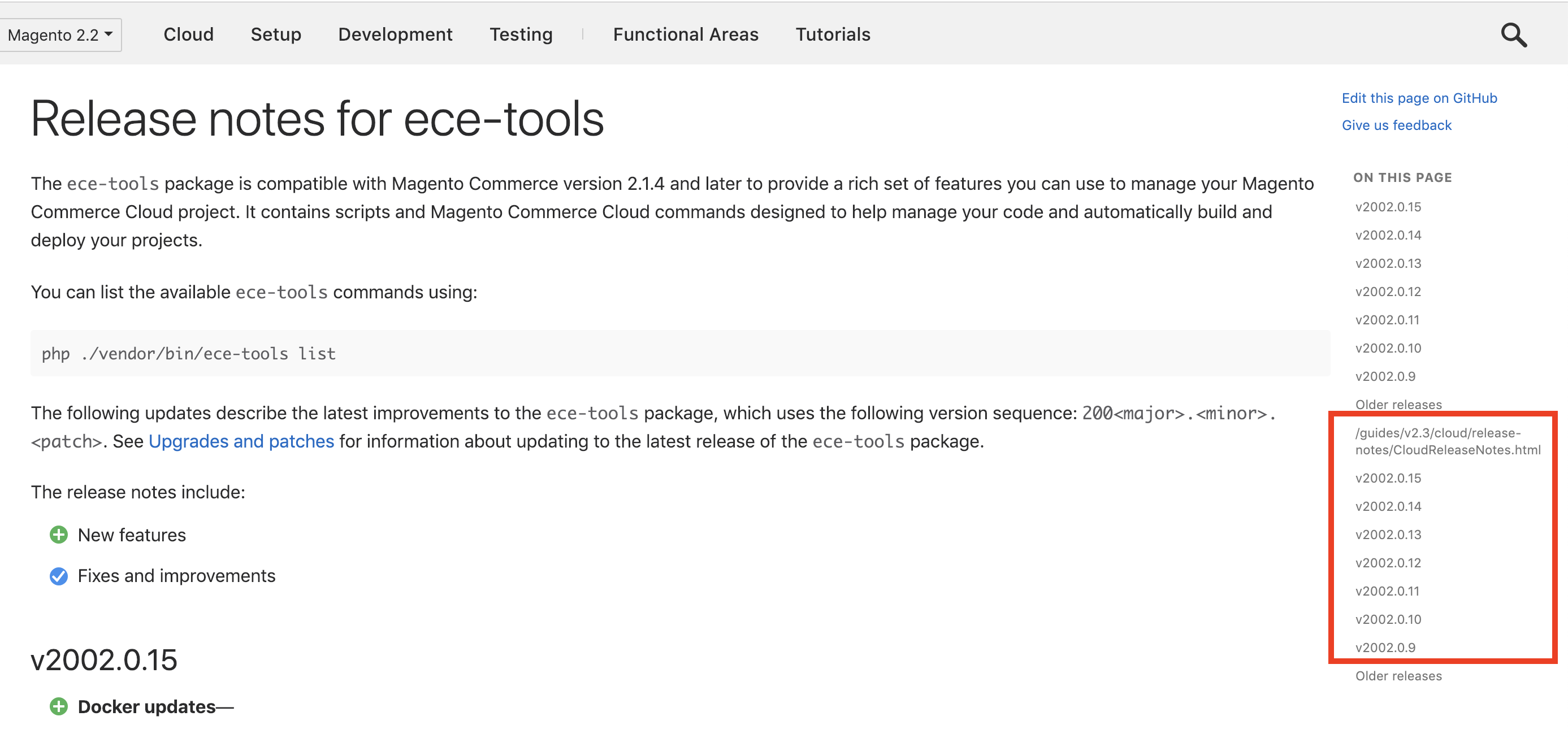 Updated Magento Commerce and Magento Commerce Cloud release information to remove obsolete topics and add links to current Magento Commerce Cloud release information in Release Notes for ece-tools.