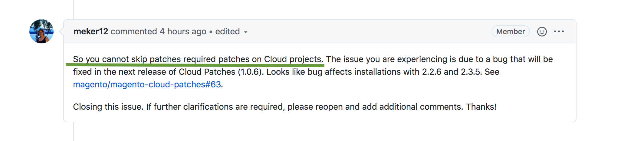 When you update `{{site.data.var.ct}}` or the `{{site.data.var.mcp-prod}}` package, the latest required patches are applied automatically the next time you deploy your project. You cannot skip [required patches](https://github.com/magento/magento-cloud-patches/tree/develop/patches) them during a deployment process. |