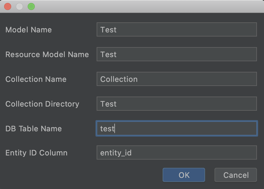 Add the model via the context menu on the module folder. After generating model classes, the generated code contains highlighted code sections.