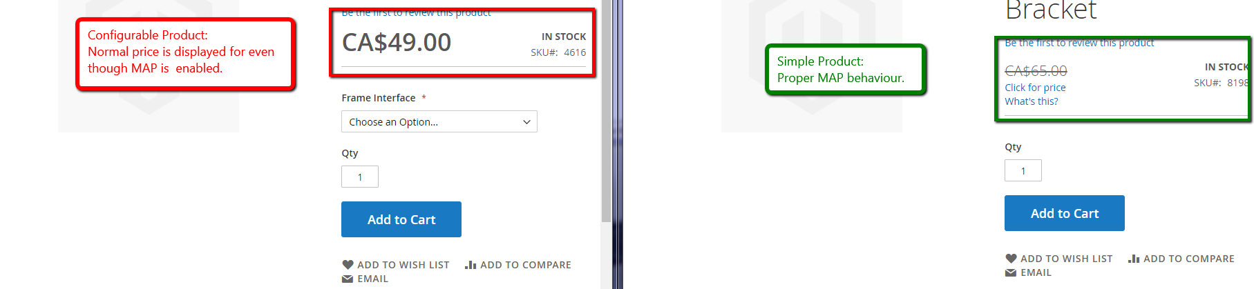 - Created linked virtual products, set a value for MSRP > Price and select 'Use config' for Display Actual Price.