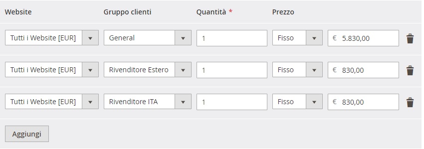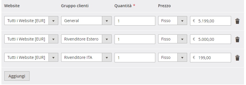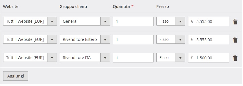 - Go to the catalog page in frontend logged as customer assigned to a specific group (ex. Rivenditore ita)