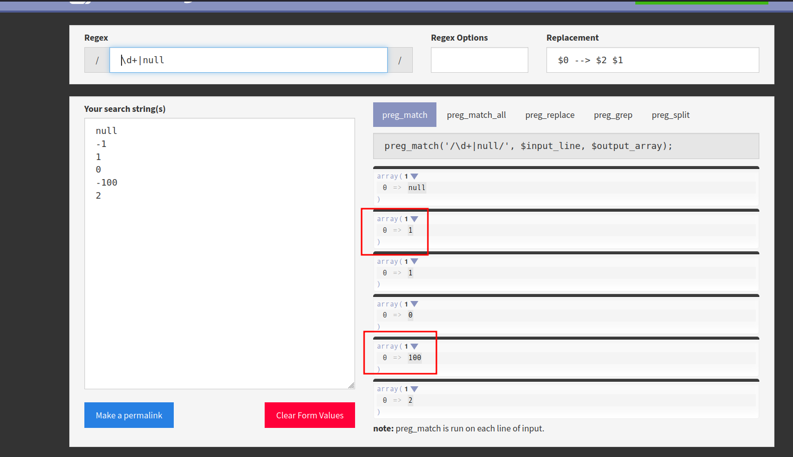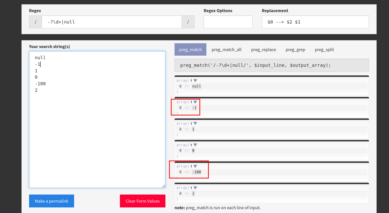 After change to -?\d+|null, it returns the same value as the test value: