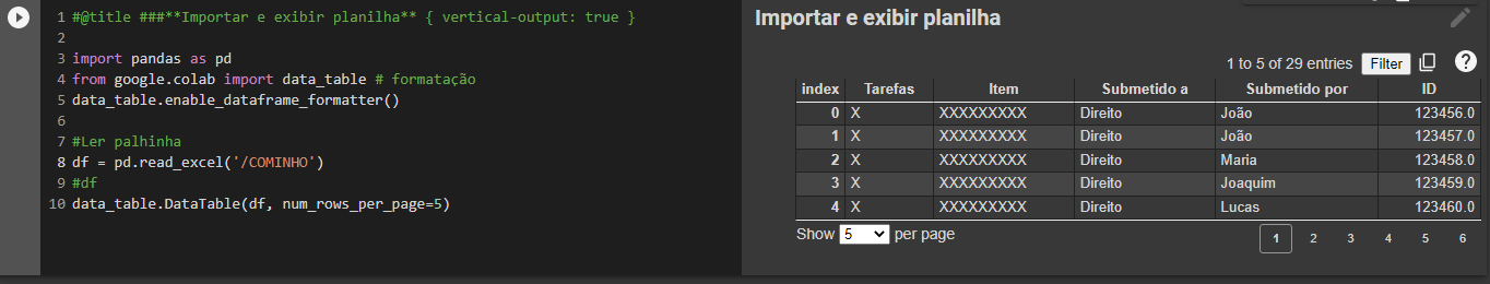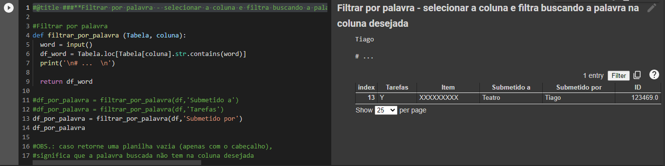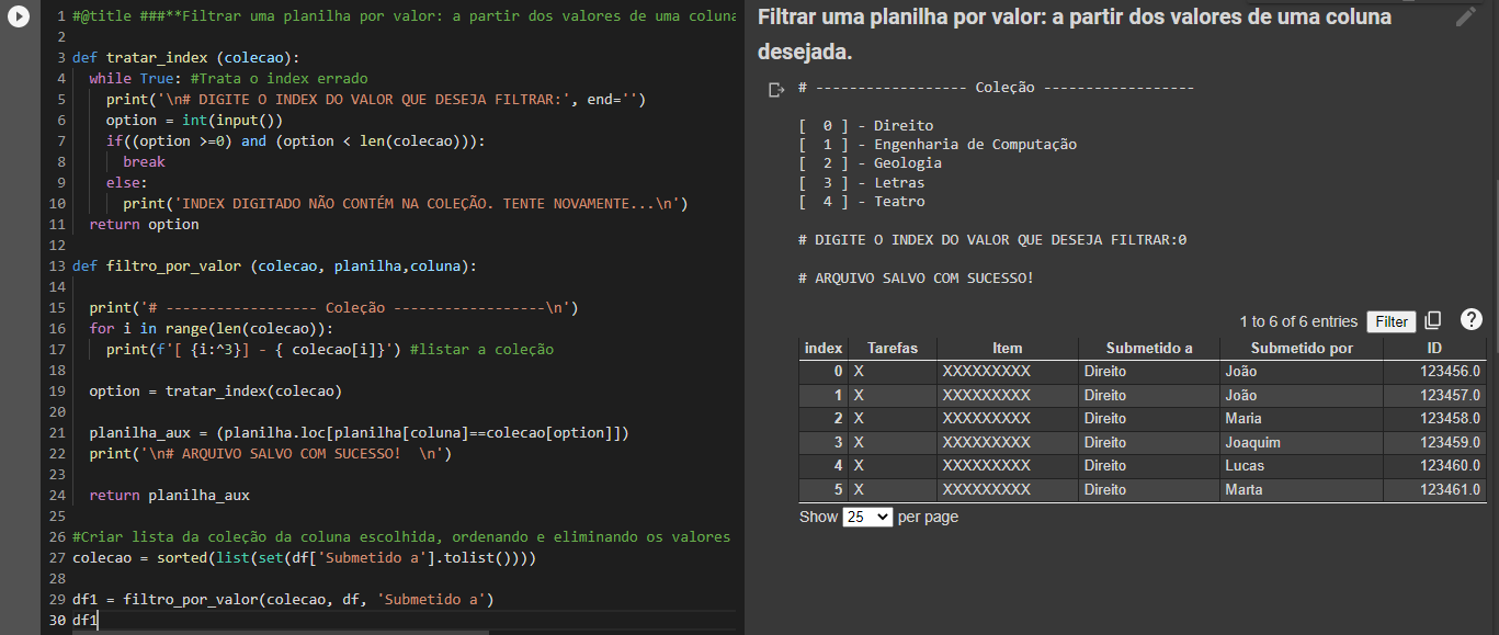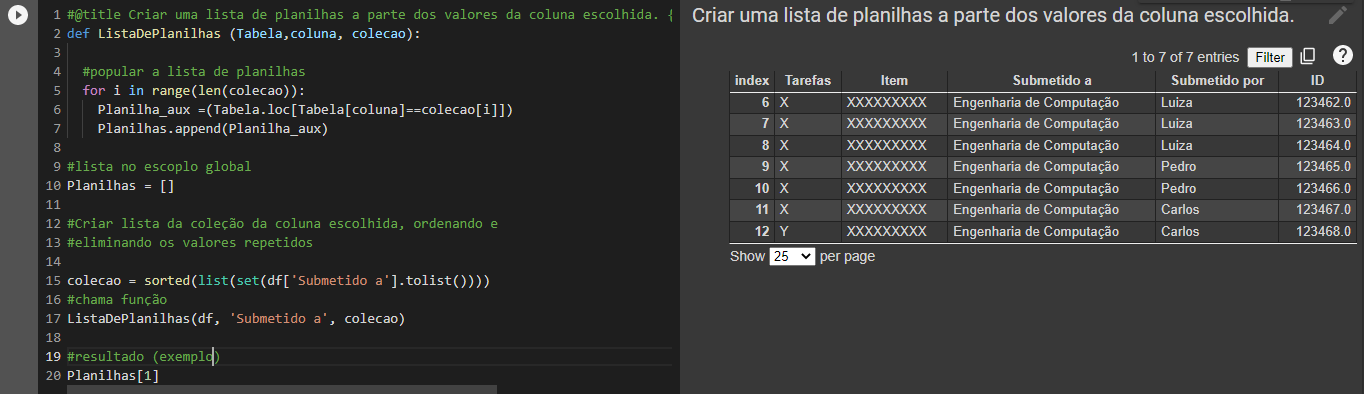 Python - Google Colab 01. Importar e exibir planilha 02. Criar uma lista de planilhas a parte dos valores da coluna escolhida. 03. Filtrar uma planilha por valor: a partir dos valores de uma coluna desejada. 04. Filtrar por palavra - selecionar a coluna e filtrar buscando a palavra na coluna desejada. 05. Gerar planilhas de quantitativo por tarefa e usando filtro