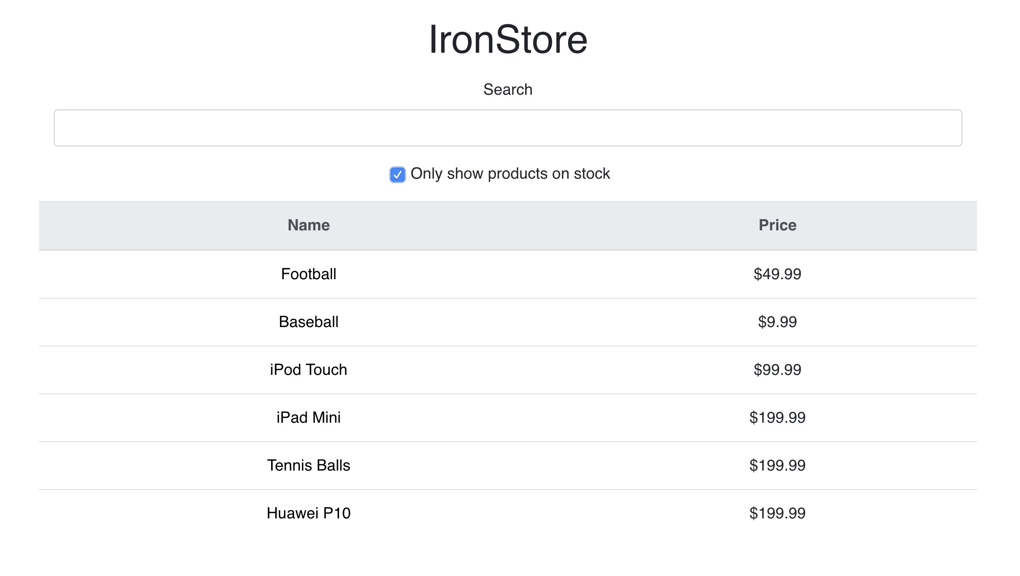 Also, notice that products that are out of stock are displayed in red. Hint: In your ProductRow component most likely you will receive some props from parent component. props will be product object, again most likely