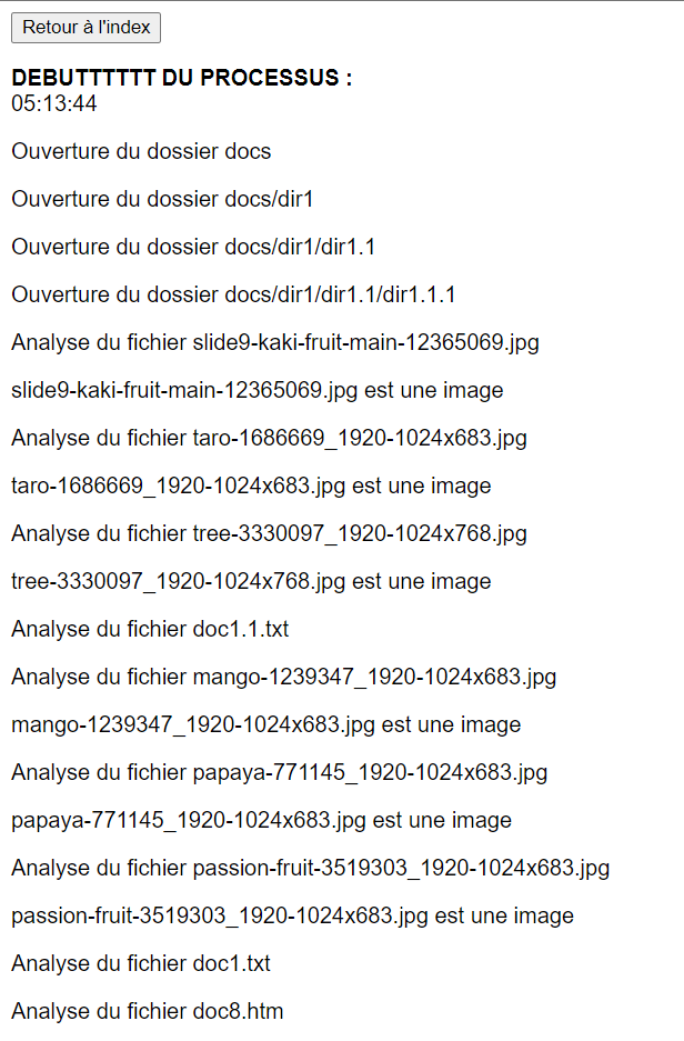 Un bouton de retour à l'index est présent en haut et en bas de la page. De plus, l'heure de début du processus, les étapes de ce dernier ainsi que l'heure de fin du processus sont affichés.