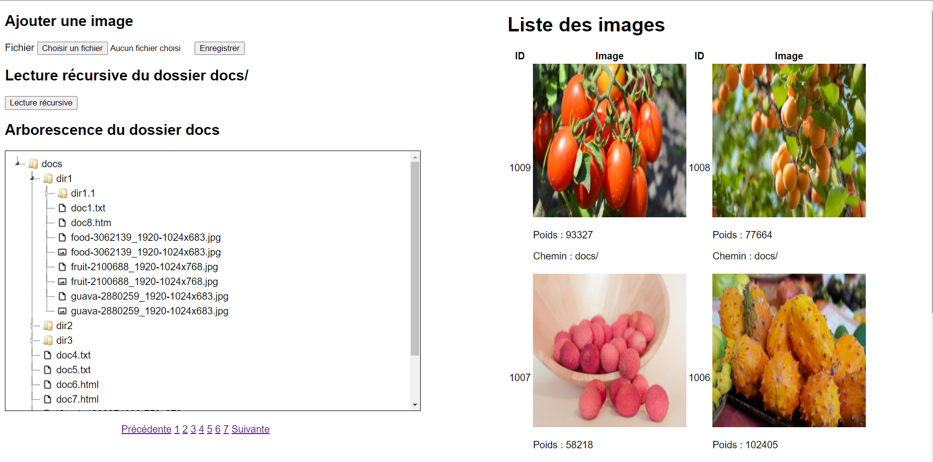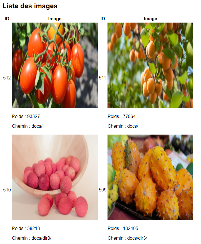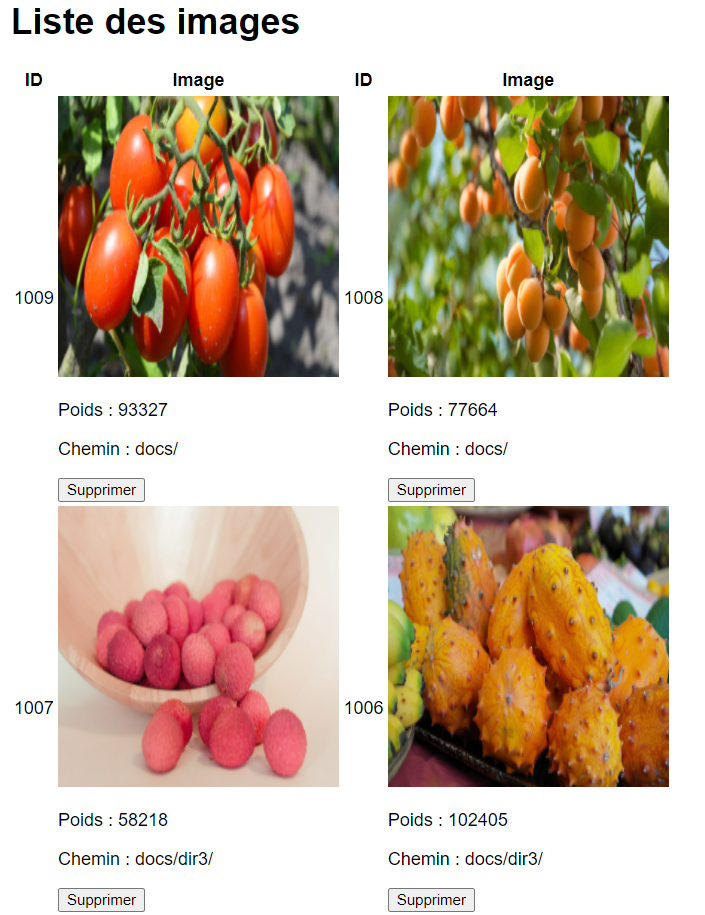 La page index.php permet d'afficher les images présentes dans la base de données. Celles-ci sont affichées sous la forme d'un tableau de taille 2x2 montrant le numéro de l'image dans la base, sa taille et le dossier dans lequel elle se situe.