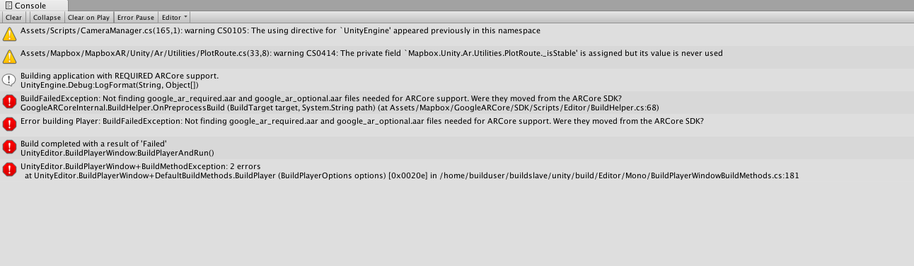 HI! I finally figured out how to solve this bug. In the Google AR Core SDK folder, find a file called BuildHelper.cs. Then find the location of the files google_ar_required.aar and google_ar_optional.aar. Modify lines 61 and 62 in BuildHelper.cs to reflect the true location of these two files. Works for me so far! |