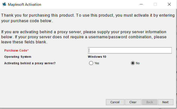 i installed maple soft and when i opened it i got the following window! can you please tell me how can i find the purchase code or, any version of maple which has the purchase code ?