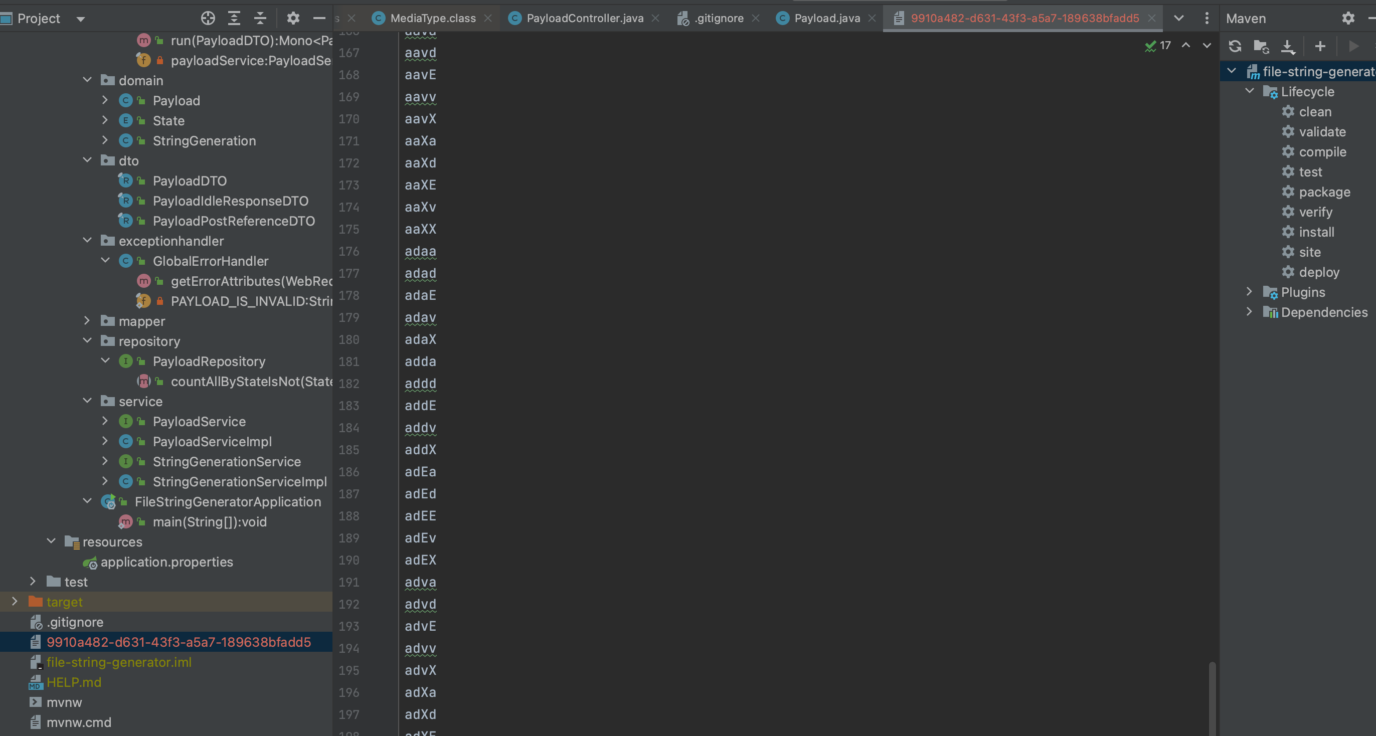 Application generates a file with random unique strings after entering specified endpoint. User of api has to specify from what charaters the strings are about to be made, min and max size of strings and amount of them. Project uses webflux, and embedded mongo-db for storing payloads.