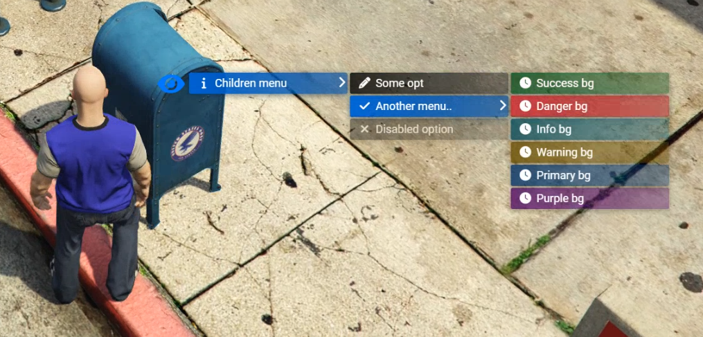 List<string> BonesPlayer must aim at specific bone of entity.bool EnableInVehicleIf the option is enabled in vehicle. (ex. player must leave vehicle to interact with mailbox)float DistanceDefines maximum distance between targeted object and player. Default7max100bool callback CanShowCustom callback, which is called before the option is displayed. Return value True|False defines if the option should be displayed in the menu or not.bool callback CanInterractCustom callback, which is called after the option is displayed and decides whether the option isdisabledor not.