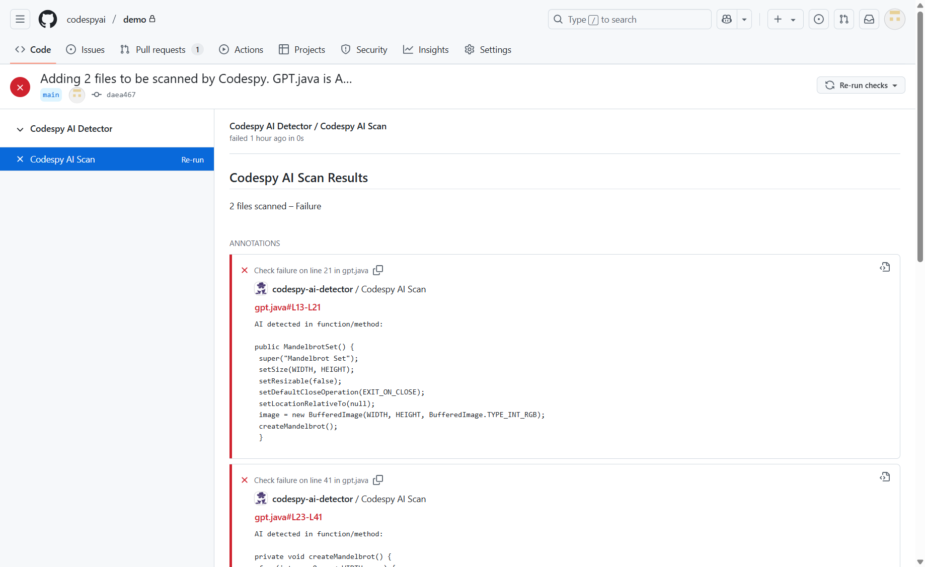 The Codespy AI Github App is a Codespy integration that allows you to scan your source code for AI during a push or pull request. Any code file that is supported (Java, JavaScript, Python, PHP, C++, and C#) will be automatically scanned, and the results will show up as a Github check for the repository.