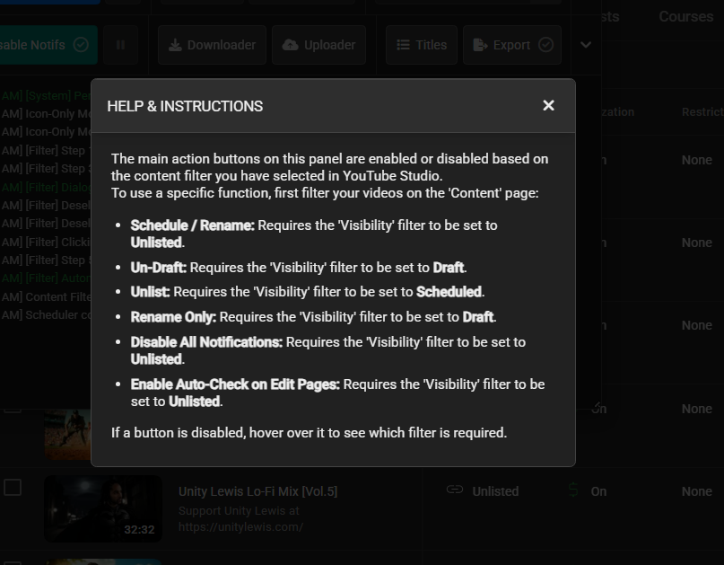 - Bulk-converts all "Premiere" (scheduled) videos to "Unlisted" status.