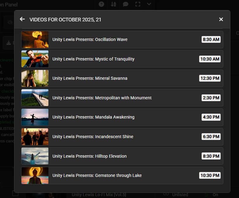- Optionally includes scheduled time (slower, requires opening each video).