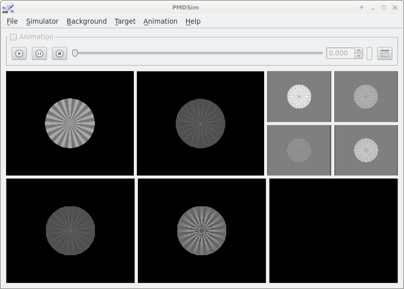 In the top right view, you see the four phase images that the simulated PMD sensor produces for the scene. You can change simulation parameters from the Simulator menu.
