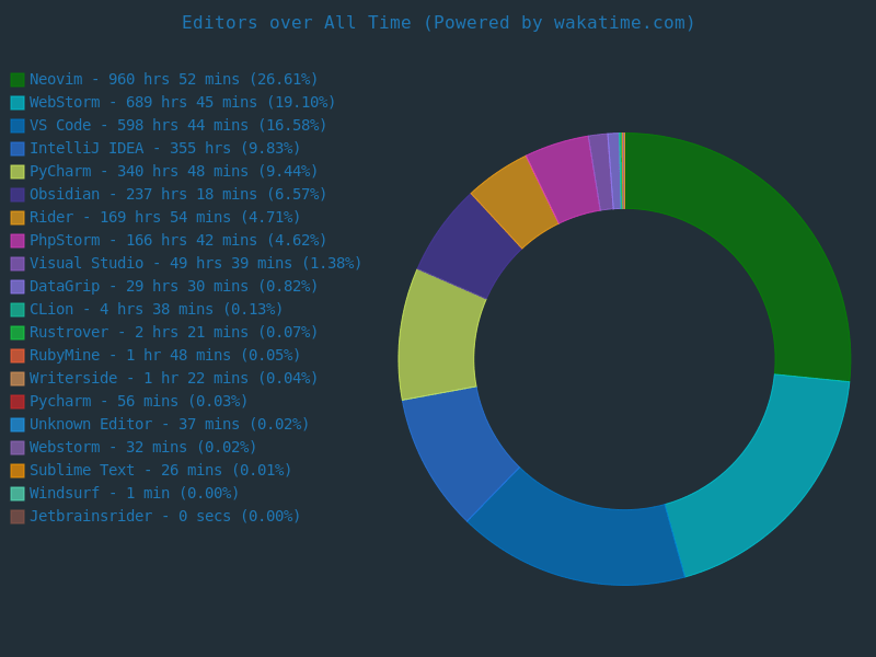Lua 106 hrs 22 mins βββββββββββββββββββββββββ 02.99 %My full stats are visible through this url: https://wakatime.com/@Amauri22
