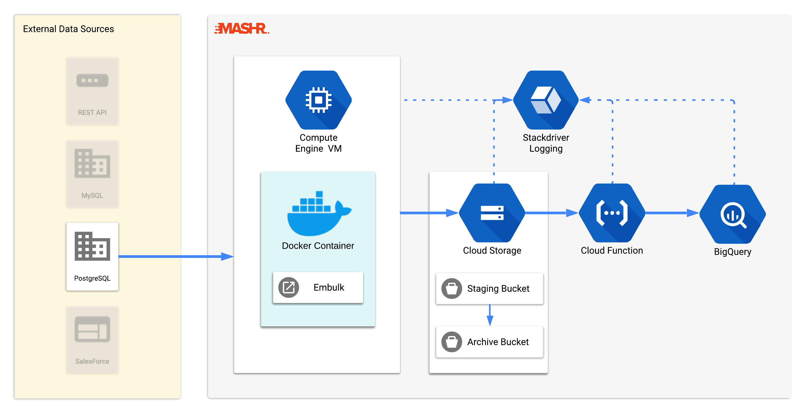 Mashr sets up a GCE instance, with Embulk running on a Docker container. The container has a cron job running that pulls data from the source and loads it into Google Cloud Storage. Adding the data to GCS triggers the Cloud Function. The Cloud Function attempts to load the data into BigQuery. If the load is successful, the Cloud Function moves the data file from the staging bucket to the archive bucket. If the load is not successful, the data file remains in the staging bucket for debugging purposes. Each step of this process has Stackdriver monitoring enabled so users can debug the data pipeline if necessary.