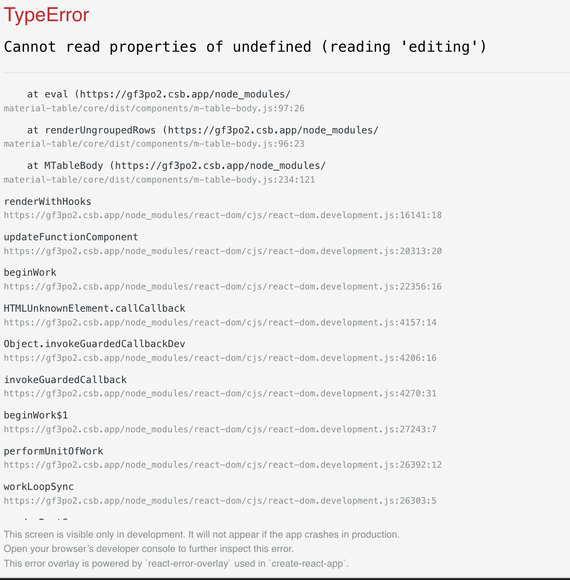 When implementing editable table as described here https://material-table-core.com/demos/edit/editable, row delete crashes the app