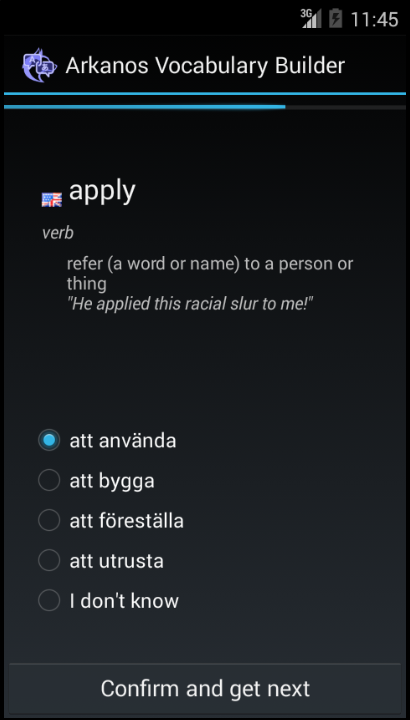 Arkanos Vocabulary Builder is an Android application for browsing, training and improving vocabulary in foreign languages. It is build on top of WorNet 3.0 and uses an external translation database to compile a fuzzy network of translations with semantics, not only single worded translations.