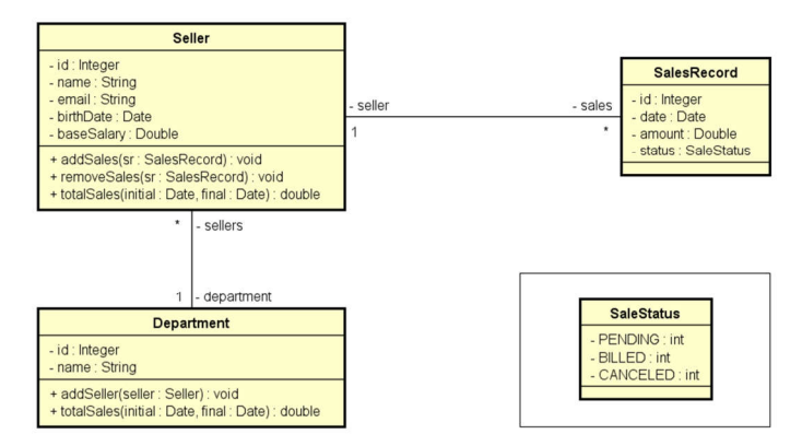 - Total de três entidades relacionadas: Seller, Department e SalesRecord
