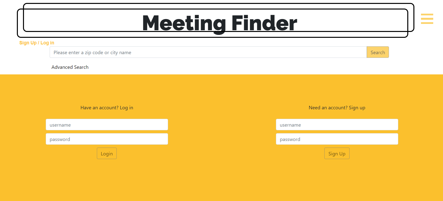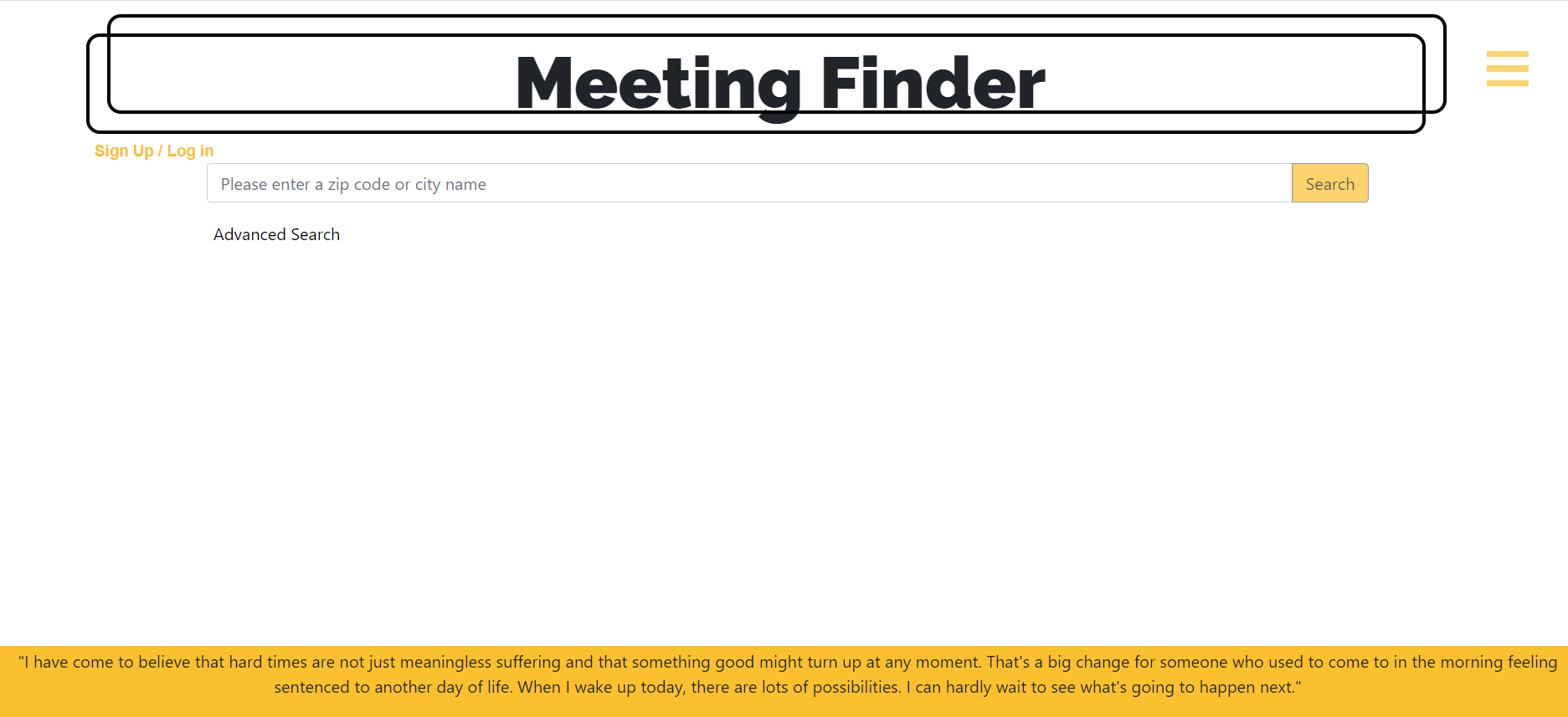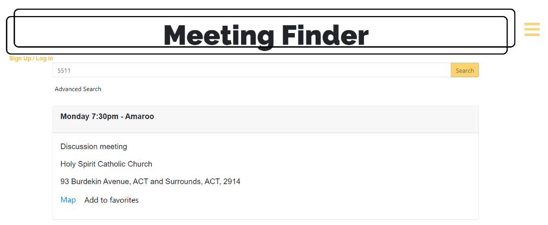 An Alcoholics Anonymous meeting locator (currently limited to meetings in Australia because of availability of good API coverage) that allows users to find meetings based on search criteria. Users are given the option to sign in, create a new account, or use the application as guest. Upon login, users can save searched meetings and view saved meetings. All users will find an advanced search option to filter results by day and time of day. A link to Google Maps is also available for each meeting for guests and returning users.