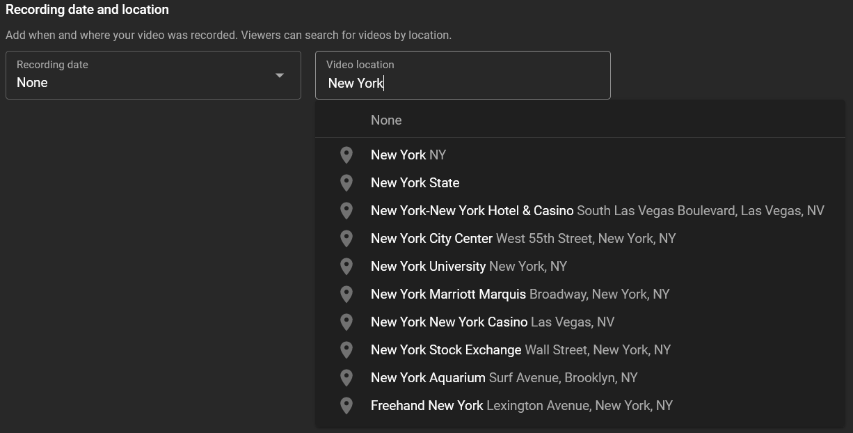 It is also important to note that the coordinates do not necessarily mean that exact position. The location may be at almost any scale, an actual address or point of interest, street, road, town, city, zip code, state, country, and so on... almost anything that is valid in Google Maps. While they appear to have a specific coordinate it is more likely set for the generalized area. For example, a video that is set to 40.7830603, -73.9712488 ≡ Manhattan is most likely not at the particular building where the Manhattan marker is located but in reference to somewhere in the entire Manahattan area as visualized in Google Maps.