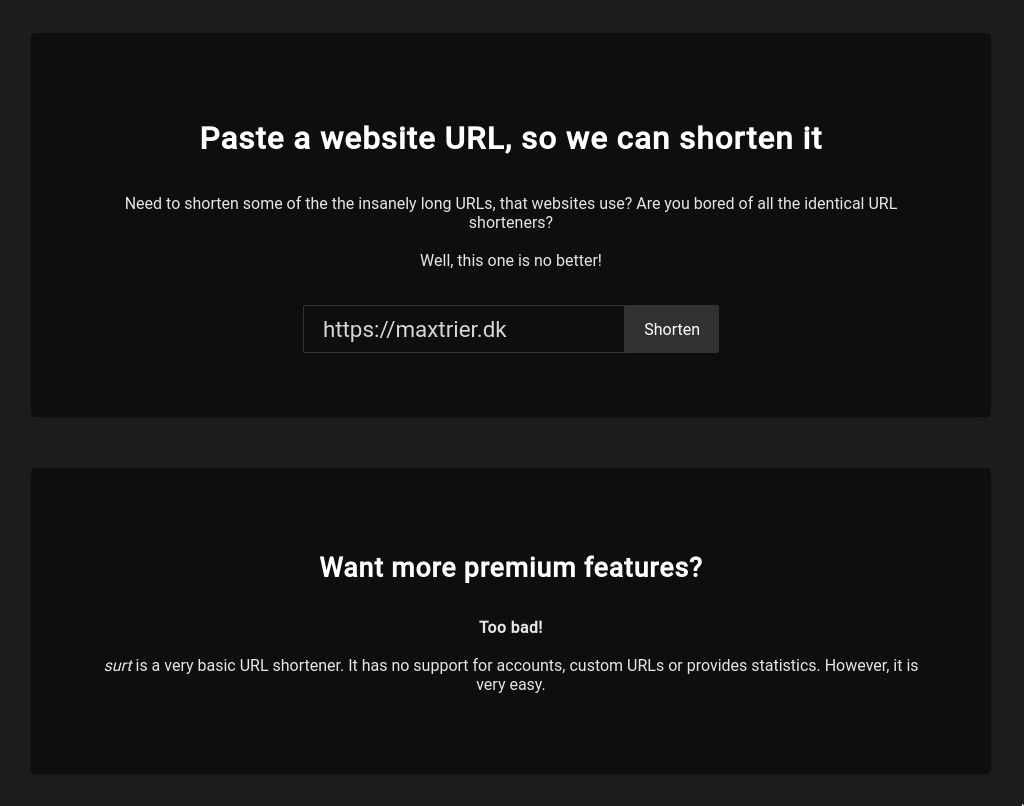 surt (/suɔrt/, means black in Jutlandic) is a basic link shortener, written in Next.js.