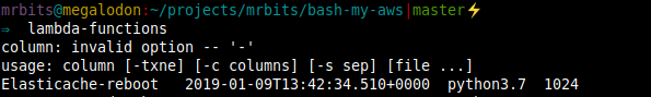 columncommand version in Ubuntu 18.04, that doesn't have the--helpoption,lambda-functionsreturns the followingo error:After the error, lambda functions are listed.