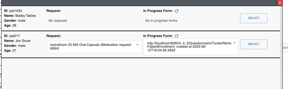 Add a select button to each patient row. If no data, don't show dropdown and show label saying 'no in-progress forms". Added a refresh button next to the in progress forms to allow for a refresh when the patient select modal is open. Update language of medication in dropdown once selected, it adds medication request number after the name of medication now. The open in-progress form button now is enabled at any point when there is a in progress form loaded in.