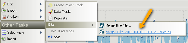 - Select the Edit > iBike > Merge iBike File... item as shown below