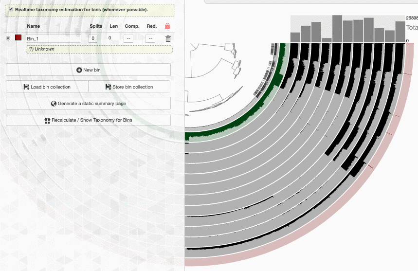 In previous versions anvi'o has relied on multiple heuristics to predict the domains of selected contigs or genomes for the determination of which SCG collection to use to estimate and display completion and redundancy. In this version we have a brand new random forest classifier to take care of this challenging task. This robust classifier with appropriate addition of noise solves this issue like magic, and when you have a bunch of genomes, it gives you proper estimates in the interface (the example is also from the infant gut dataset),