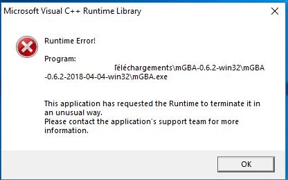 I tried to use your mgba.exe with the official release (copy paste your mgba.exe in the mgba.exe 0.6.2). Result is the same :)