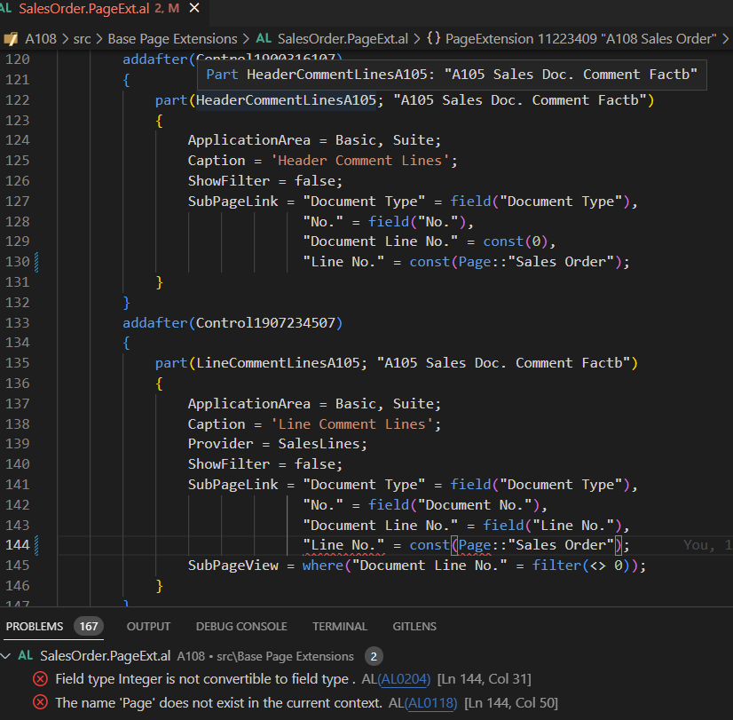 The AL compiler recognizes the translation of 42 to Page::"Sales Order" on the SubPageLink of the HeaderCommentLines but fails on the same property on the LineCommentLines. Probably has something to do with the use of the Provider property.