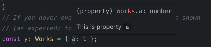 - JSDoc documentation for interface members does not show in tooltips for properties on anonymous objects that are typed to those interfaces #18358 also seems to claim to have fixed this problem, but the "working" example shown uses the "per-property" help text (like