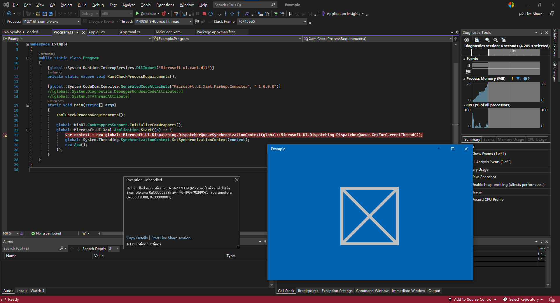 Unhandled exception at 0x5A217FD9 (Microsoft.ui.xaml.dll) in Example.exe: 0xC000027B: An application-internal exception has occurred. (parameters: 0x055D3D88, 0x00000001).