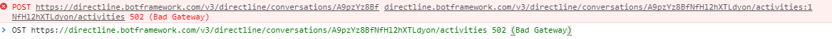 directline.botframework.com/v3/directline/conversations/A9pzYz8BfNfHl2hXTLdyon/activities:1 POST https://directline.botframework.com/v3/directline/conversations/A9pzYz8BfNfHl2hXTLdyon/activities 502 (Bad Gateway)