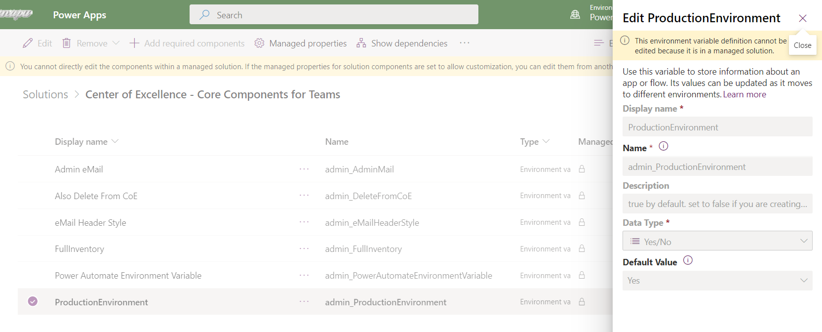 - Select ProductionEnvironment variable, it clearly says "This environment variable definition cannot be edited because it is in a managed solution" on top.