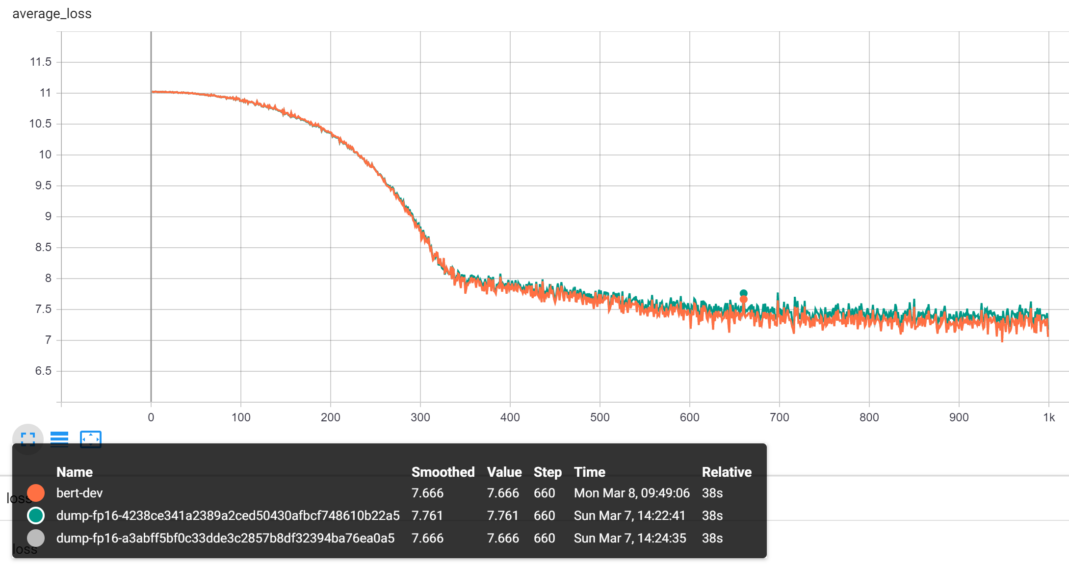 The used script is from ORT's BERT example (based on NV-bert). To speed up the experiment, we use very small model but that model is enough for detecting mixed-precision problem within 1 min. Here is the configuration we use