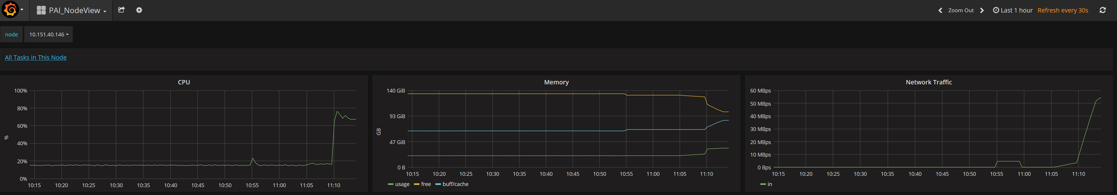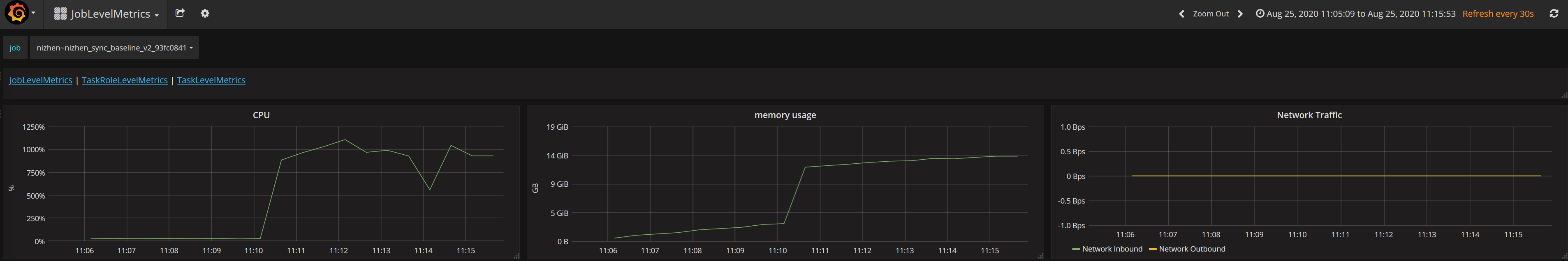 Then I change to the node-view and find that the consumed network bandwidth is not zero this time(the job started at 11.05). So I think the network bandwidth monitoring script may have some bugs.